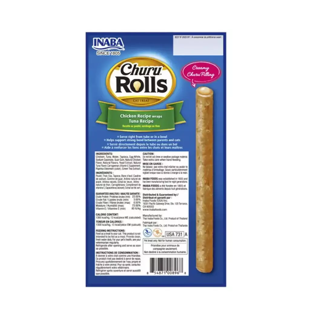 Los Churu Rolls son snacks de pollo natural blandos y en barritas, sazonadas con sabores naturales, extracto de té verde y vitamina E. Sin cereales, conservantes ni colorantes artificiales. El núcleo blando es ideal para esconder pastillas o suplementos.