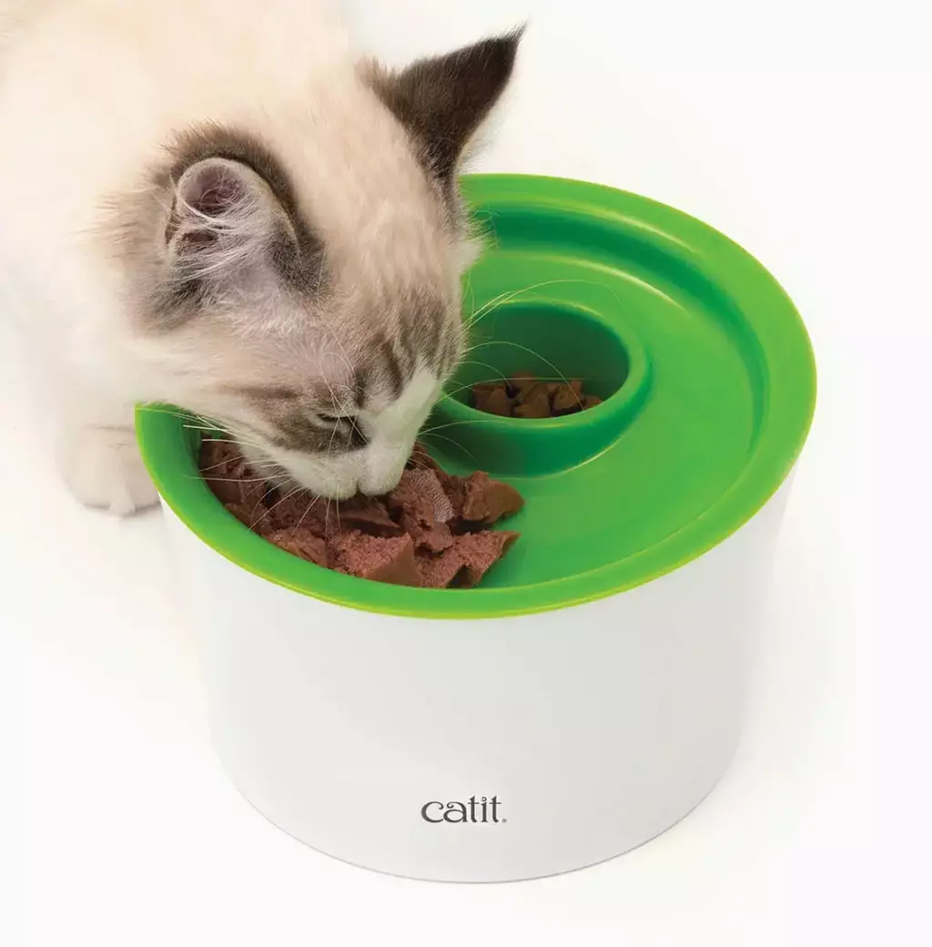 Comedero Multi Feeder Comedero elevado ergonómico con agujero antivoracidad incorporado, anima a tu gato a sacar gradualmente pequeñas porciones de comida seca del agujero del centro. Cuenta con un plato elevado que es poco profundo y por lo tanto no toca los bigotes de tu gato y un espacio de almacenamiento integrado para la comida de tu gato.
