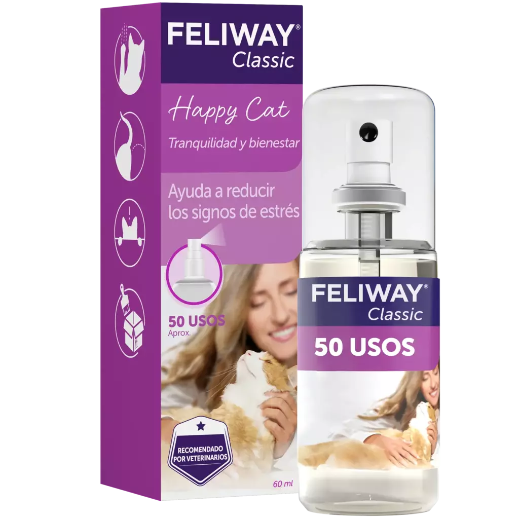 FELIWAY CLASSIC Happy Cat Spray 50 Usos, ofrece seguridad y tranquilidad durante los viajes y apoyo adicional en el hogar.