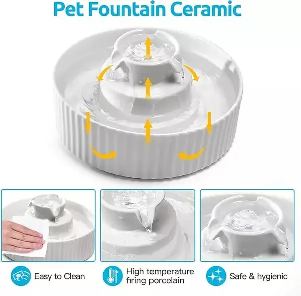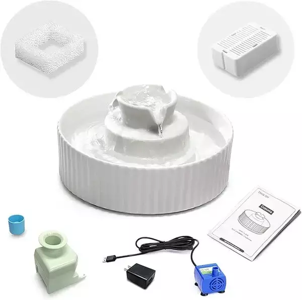 Fuente en Cerámica Cupcake, mantén a tu mascota siempre hidratada con nuestra fuente de cerámica para perros y gatos, diseñada para ofrecer agua limpia, fresca y en constante movimiento. Con una capacidad de 2.1 litros, es perfecta para hogares con una o varias mascotas.