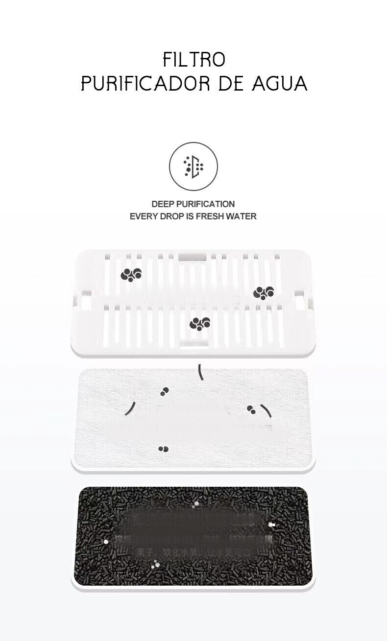 Su sistema de filtración con carbón activado elimina impurezas, malos olores y sabores, garantizando agua más pura y agradable, además el flujo continuo del agua evita el estancamiento, estimulando a perros y gatos a beber más, lo que favorece una mejor salud renal y urinaria.