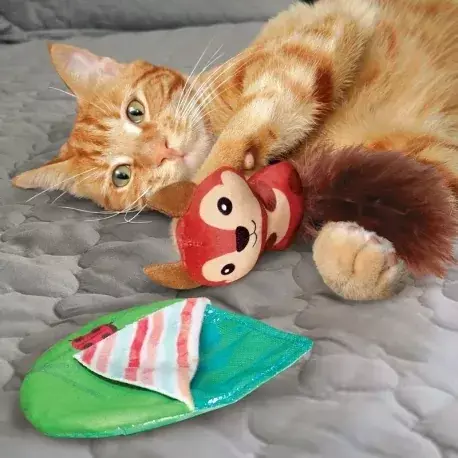 KONG Pull-A-Partz Tuck es una ardilla con plumas irresistibles en su cola, que tienta al gato para jugar con el y sea cazado. Los dos juguetes se desmantelan proveyendo la sensación de casa y búsqueda. maneja Catnip premium de KONG.