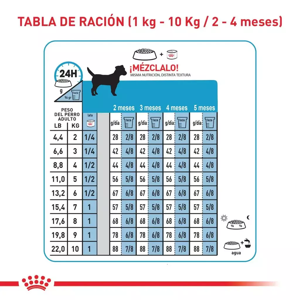 ROYAL CANIN® Mini Puppy, está especialmente formulado para satisfacer las necesidades nutricionales de los cachorros de razas pequeñas. Esta fórmula es adecuada para cachorros de 2 a 10 meses de edad, que alcanzarán un peso de adulto de 4-10 kg. Este alimento a medida está enriquecido con un ácido graso omega-3 (DHA), que ha demostrado científicamente favorecer el desarrollo cerebral saludable de los cachorros jóvenes.