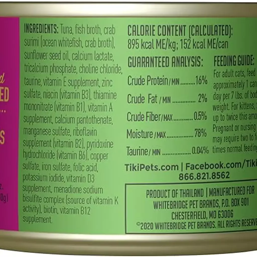 Tiki Cat Lata Ahi Tuna & Crab, Atún y Cangrejo en Caldo es la opción ideal para los gatos que merecen una alimentación de calidad. Con un 16% de proteína bruta, este alimento húmedo está diseñado para satisfacer las necesidades nutricionales de felinos de todas las edades. Su delicioso sabor a atún y cangrejo en caldo no solo es irresistible, sino que también proporciona una experiencia culinaria que hará que tu mascota se relama.