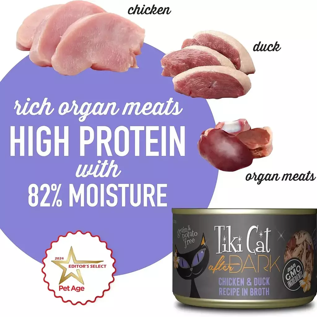 Esta comida húmeda, presentada en una lata de 80 gramos, combina la suculencia del pollo y el pato, ofreciendo un sabor irresistible que hará que tu mascota disfrute cada bocado.Con un 11% de proteína bruta, este alimento está diseñado para satisfacer las necesidades nutricionales de tu gato, asegurando que se mantenga activo y saludable.La línea Dark de Tiki Cat se enfoca en ingredientes de alta calidad, garantizando que tu mascota reciba solo lo mejor en su dieta diaria.